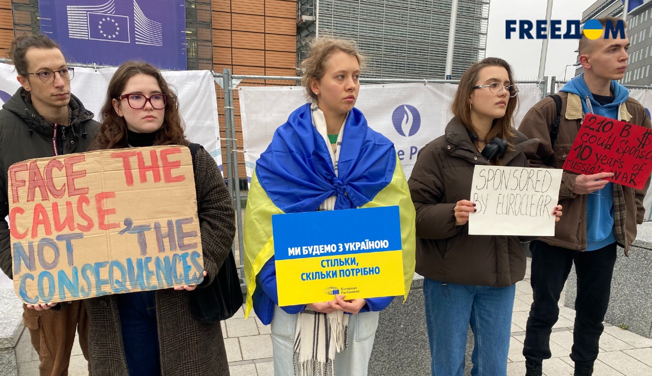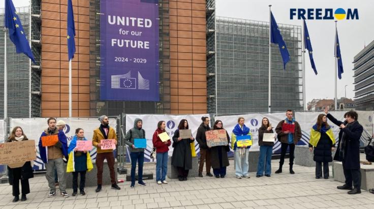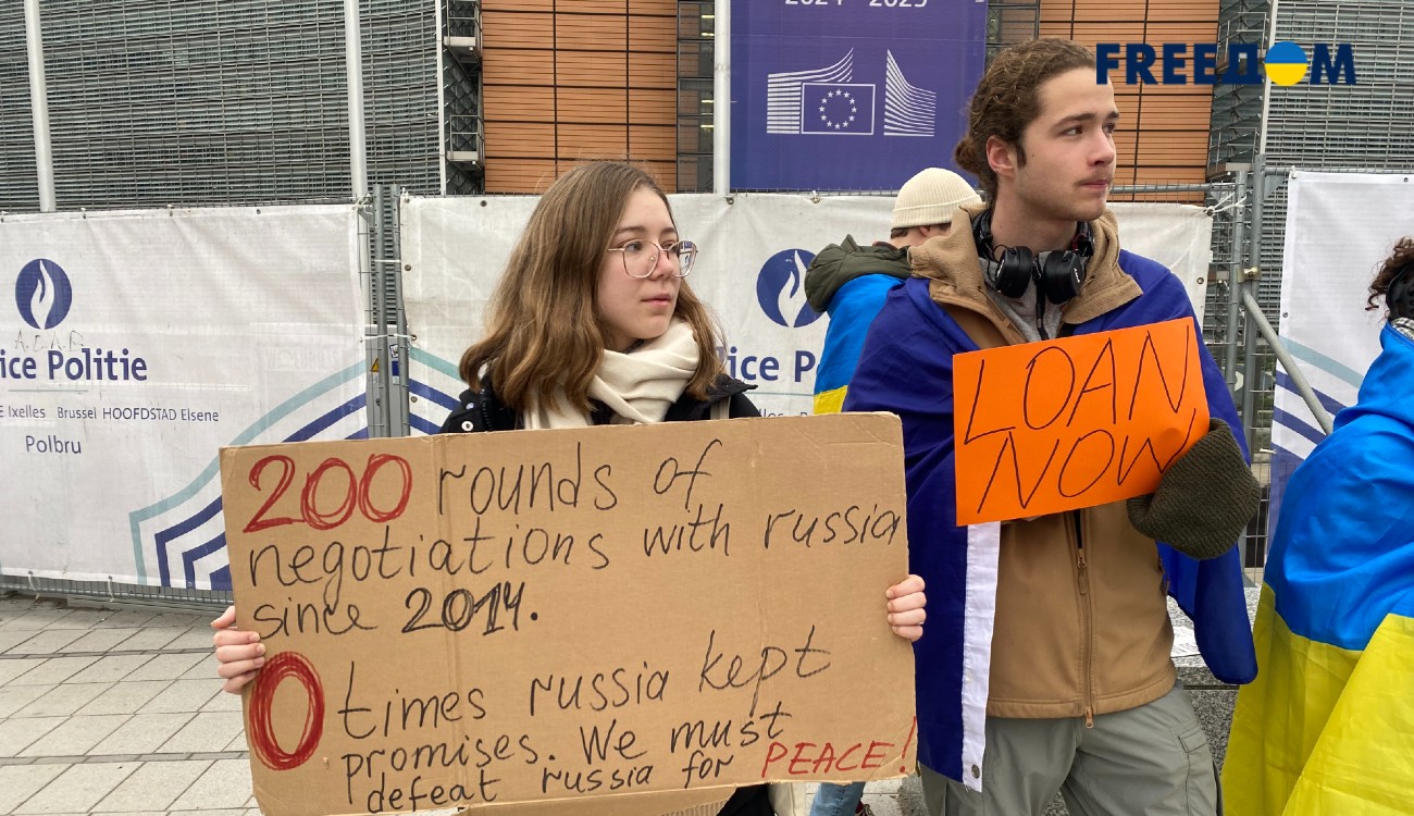 ونقل مراسل قناة "فريدوم تي في" من موقع الاحتجاج أن المشاركين حملوا لافتات كُتب عليها "يجب أن يدفع بوتين الثمن" و"يجب معاقبة روسيا" و"سنبقى مع أوكرانيا مهما طال الأمر"، بالإضافة إلى الأعلام الأوكرانية، في رسالة واضحة للقادة الأوروبيين المجتمعين.