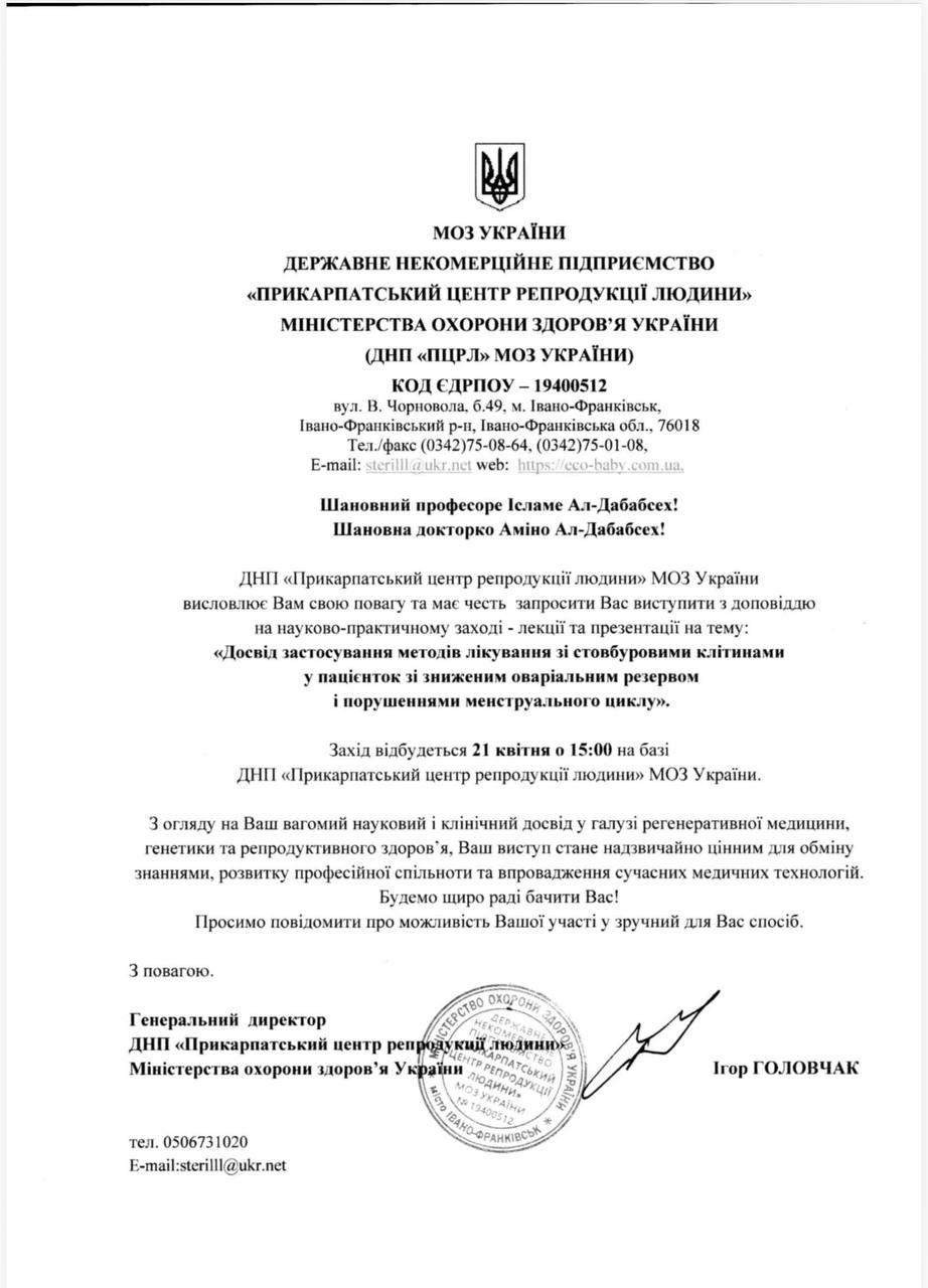 كييف/ أوكرانيا بالعربية/ تلقى معهد أي.دي. في أوكرانيا لأبحاث الخلايا الجذعية والجينية دعوة رسمية من المركز الوطني «بريكارباثيان لابحاث التكاثر البشري» بدعم من وزارة الصحة الأوكرانية، لتقديم محاضرة علمية تخصصية يلقيها كل من البروفيسور إسلام الدبابسة والدكتورة أمينة الدبابسة.