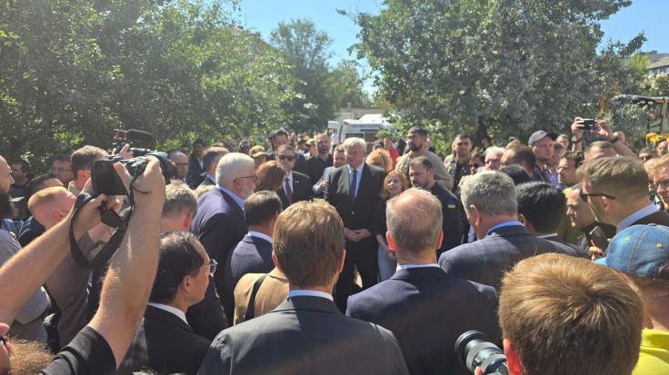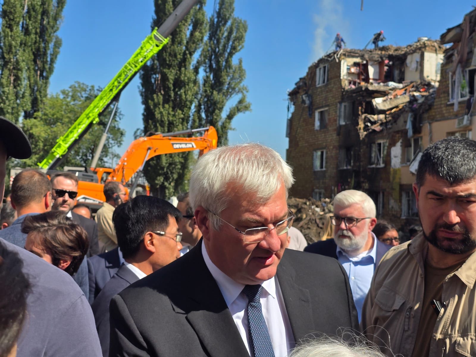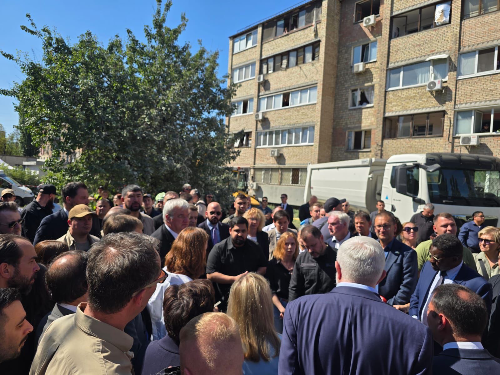 كييف/ أوكرانيا بالعربية/ نظمت وزارة الخارجية الأوكرانية في صباح 28 آب/ أغسطس زيارةً لـ 55 رئيس بعثة دبلوماسية أجنبية معتمدين لدى أوكرانيا إلى أحد مواقع الضربات الروسية ليلة الخميس - المبنى السكني في منطقة دارنيتسيا بكييف.
