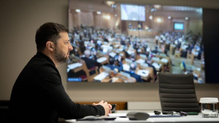 ودعا زيلينسكي إلى دعم أوكرانيا، وعملية التفاوض، والتمسك بالمبادئ التي تقوم عليها أوروبا: لا يمكن تغيير الحدود بالقوة، ولا يمكن لمجرمي الحرب الإفلات من العدالة، ويجب على المعتدي أن يدفع ثمن الحرب التي بدأها بالكامل، ولذلك فإن القرارات المتعلقة بالأصول الروسية ضرورية.
