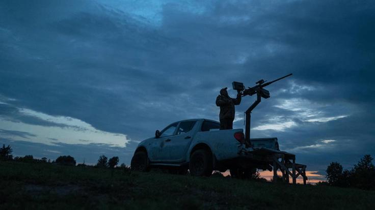 يصرخ بهذه العبارات قائد فصيلة مجموعة النيران المتنقلة التابعة للواء سومي الثامن من تشكيلة المتطوعين الإقليمية "ليسوفيك"، المدعو فولوديمير، والذي بعد أن سمع الطائرة المسيرة تقترب، قفز على شاحنة بيك آب "ميتسوبيشي L-200" بيضاء، عليها مدفع رشاش تركي من طراز "Canik M-2"، وصوّب عليها، وحاول إطلاق النار على الهدف الذي حلّق فوق رأسه، لكنه لم يستطع - لم يستدر المدفع الرشاش تسعين درجة.
