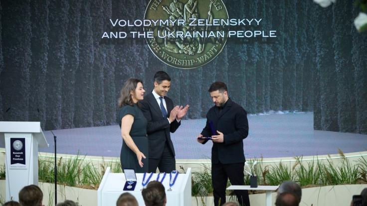 كييف/ أوكرانيا بالعربية/ تسلّم الرئيس الأوكراني فولوديمير زيلينسكي، الخميس 16 نيسان/ أبريل، في مدينة ميدلبورغ الهولندية، نيابةً عن الشعب الأوكراني، جائزة الحريات الأربع تقديرًا لشجاعته وثباته في النضال من أجل الحرية.