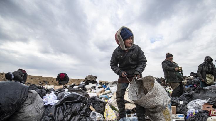 На засушливых равнинах за пределами города аль-Маликия, на северо-востоке Сирии, дюжина людей, завернувшись от холода, разрывает черные пластиковые пакеты в отчаянных поисках чего-нибудь, что можно продать, переработать или даже съесть.