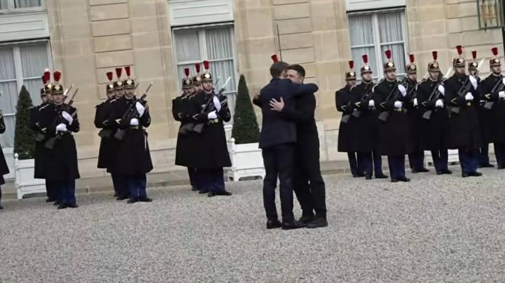 وبحسب الصحيفة، وصل زيلينسكي إلى قصر الإليزيه، حيث استقبله الرئيس الفرنسي إيمانويل ماكرون بـ"عناق حارٍ للغاية".