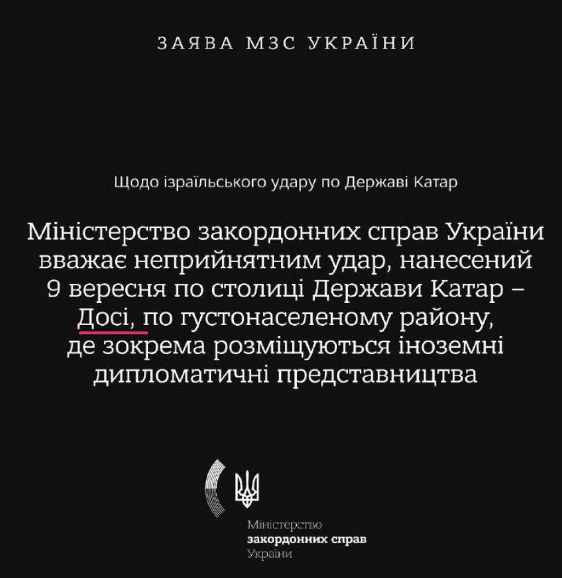 "Министерство иностранных дел Украины считает неприемлемым удар, нанесенный 9 сентября по столице Государства Катар — Дохе, по густонаселенному району, где, в частности, размещаются иностранные дипломатические представительства," — говорится в заявлении. В МИД подчеркнули, что удар по территории государства, которое "выступает посредником в мирных переговорах", является "грубым нарушением международного права".