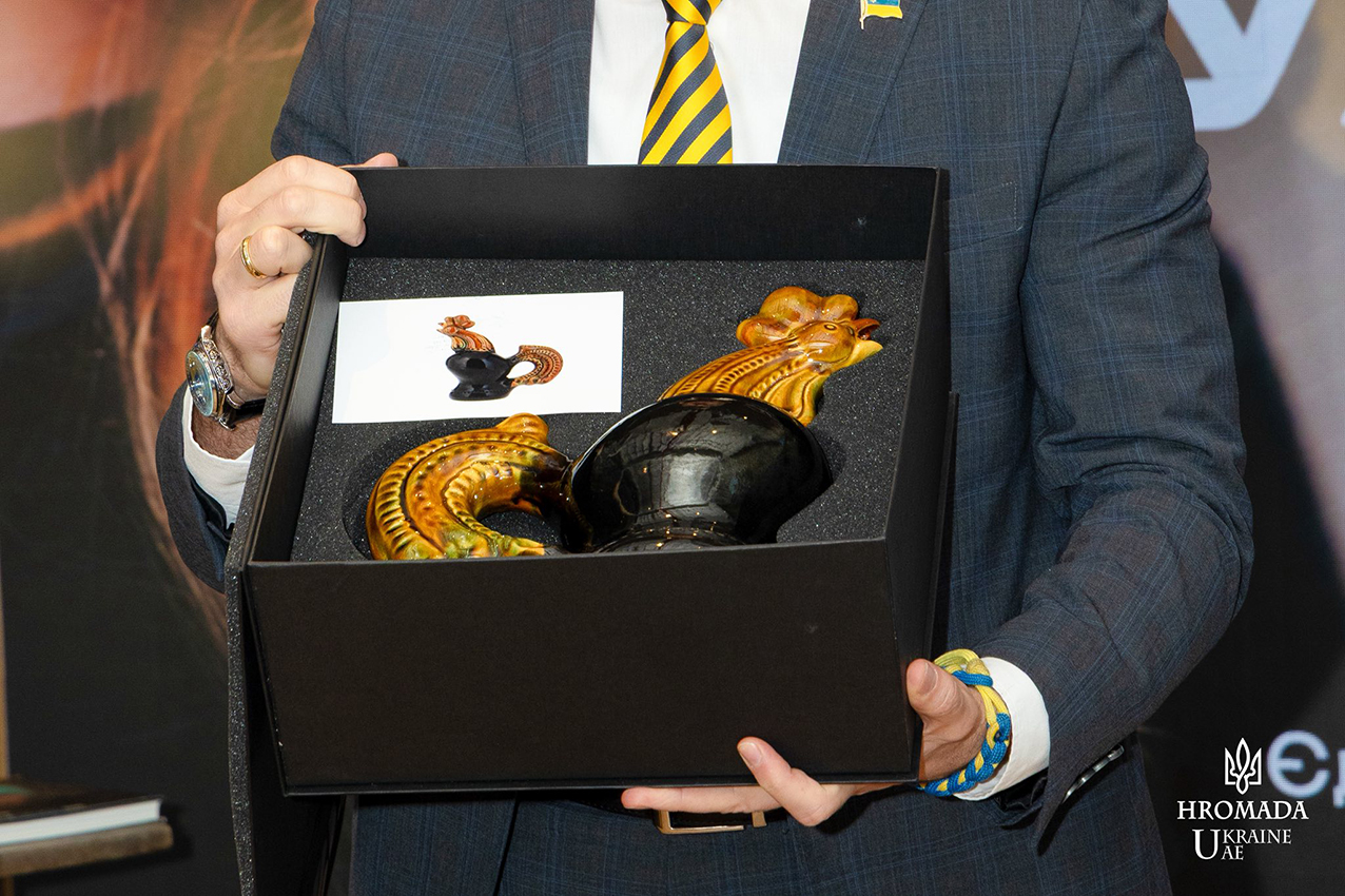 Открыл встречу Чрезвычайный и Полномочный Посол Украины в ОАЭ Александр Балануца, который, в частности, презентовал всем гостям уникальный артефакт – бородянского петушка – как мост к украинской стойкости для каждого присутствующего.