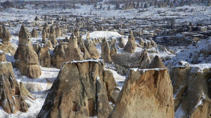 Каппадокия, один из основных туристических центров Турции, зимой превращается в снежную сказку.