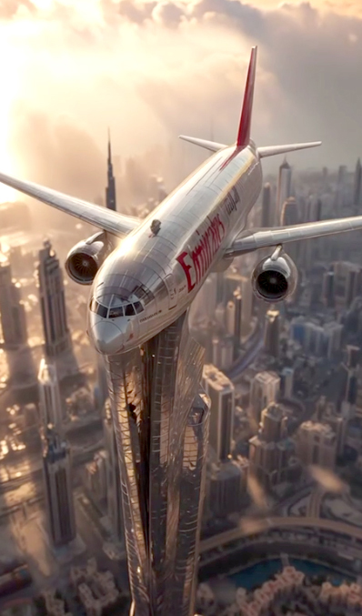 На вершині 580-метрової башти Emirates Air Hotel розмістять справжній літак Airbus A380, всередині якого облаштують бар, три ресторани рівня Michelin та скляні майданчики на крилах , басейн із панорамним краєвидом та гелікоптерний майданчик, навіть номер класу «суперлюкс» на самому верхів’ї.