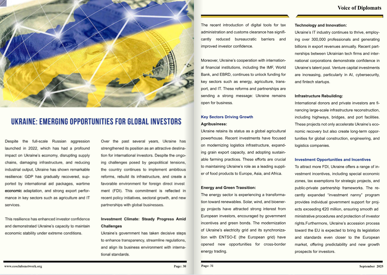 Посольство України в ОАЕ на чолі з Послом Олександром Балануцею розпочало масштабну кампанію із залучення інвестицій з Арабської затоки. Першим кроком стала публікація програмної статті Посла в авторитетному бізнес-журналі CEO Clubs Network, що об'єднує провідних керівників та інвесторів регіону.